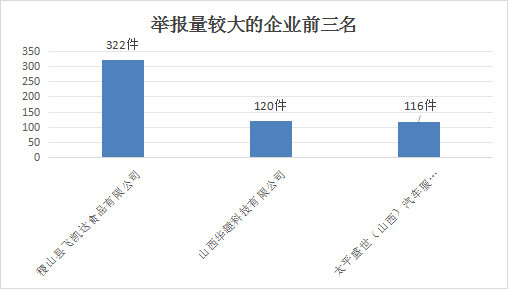 从举报企业来看,举报量较大的企业主要有:稷山县飞凯达食品有限公司(322件)、山西华趣科技有限公司(120件)、太平盛世(山西)汽车服务有限公司(116件)。