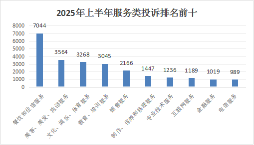 2025年上半年,服务类投诉排名前三位的热点依次为:餐饮和住宿服务类、美容美发洗浴服务类、文化娱乐体育服务类。与2024年上半年相比,美容美发洗浴服务类超过教育培训服务类位居第二。详见下图: