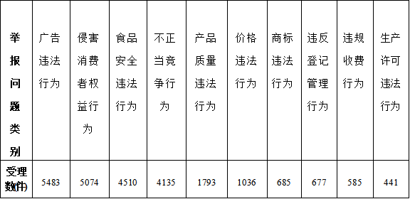 从举报问题来看,举报量较大的问题主要有:广告违法行为、侵害消费者权益行为、食品安全违法行为、不正当竞争行为、产品质量违法行为、价格违法行为、商标违法行为、违反登记管理行为、违规收费行为和生产许可违法行为等。详见下表: