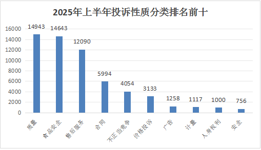 2025年上半年,根据投诉性质分类,在受理的所有投诉问题中,排名前五位的热点依次为:质量投诉、食品安全投诉、售后服务投诉、合同投诉、不正当竞争投诉。详见下图: