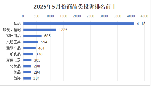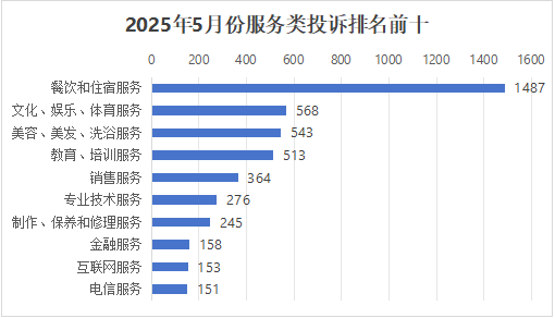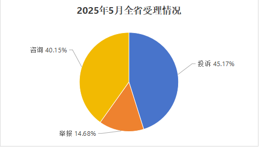 2025年5月份,全省12315机构共接收投诉17445件,其中,商品类投诉11393件,占投诉总量的65.31%;服务类投诉6052件,占投诉总量的34.69%。