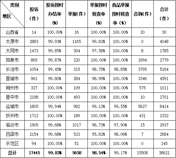 5月份,从全省各市、示范区局工作机构受理消费者投诉举报情况看,投诉量位居前三的市局为太原市、晋中市、吕梁市,投诉量分别为2883件、2198件、2154件;举报量位居前三的市局为太原市、临汾市、运城市,举报量分别为1165件、1017件、982件。详见下表:
