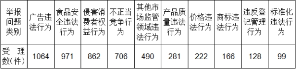 从举报问题分析,广告违法行为占举报问题首位,达1064件,占举报量的18.77%。主要反映问题为:商家在销售中虚假宣传等。